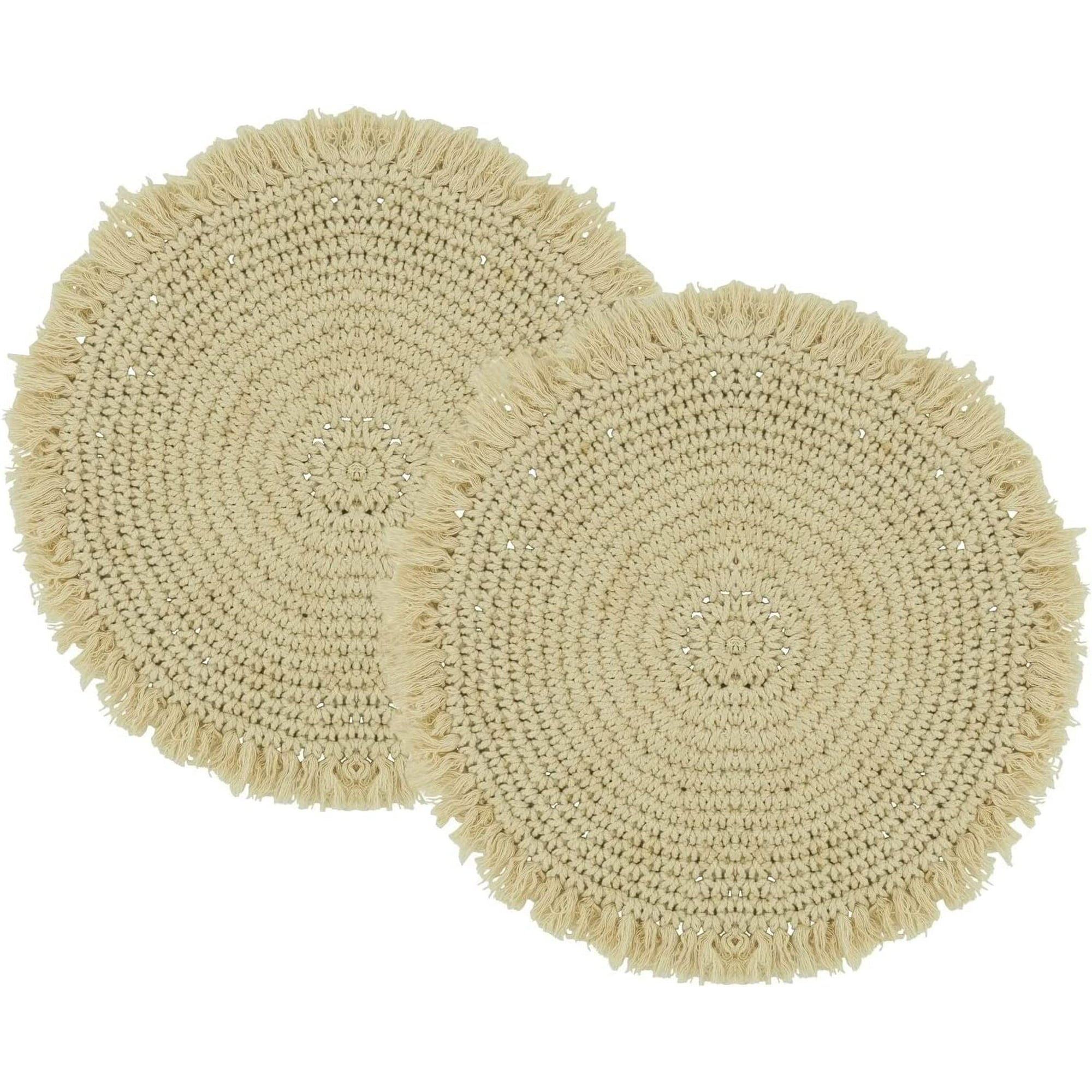 Fennco Styles Boho Macrame Cotton Placemats 15" Round, Set of 2 - Natural Braided Fringe Table Mats for Home, Dining Room, Banquets, Family Gathering and Special Events